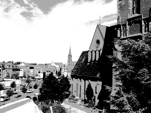 Blick von der Antonius Kirche über den Roermonder Platz zur Marien-Basilika Kevelaer